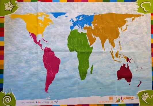Basis des Spiels ist eine Weltkarte in der flächentreuen Gall-Peters-Projektion. Diese Karte ist in verschiedenen Größen erhältlich, so dass sie etwa in einer Klasse gut einsetzbar ist. Eine Handreichung macht Angebote, wie mit Hilfe der Karte tiefer in das Verständnis der heutigen Welt eingetaucht werden kann und wie die weltweit herrschende Ungleichheit und Ungerechtigkeit sichtbar gemacht werden kann. Auf diese Weise kann etwa recherchiertes Wissen sichtbar gemacht werden, können die Welt-Verhältnisse plastisch dargestellt werden und können Gesprächsanlässe für die Beschäftigung mit den Themen des globalen Lernens und der BNE im Religionsunterricht geschaffen werden.